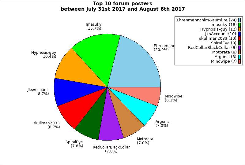 | Top 10 forum posters between July 31st 2017 and August 6th 2017 | ||