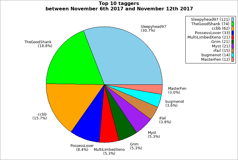 | Top 10 taggers between November 6th 2017 and November 12th 2017 | ||