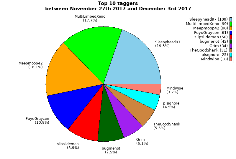 | Top 10 taggers between November 27th 2017 and December 3rd 2017 | ||