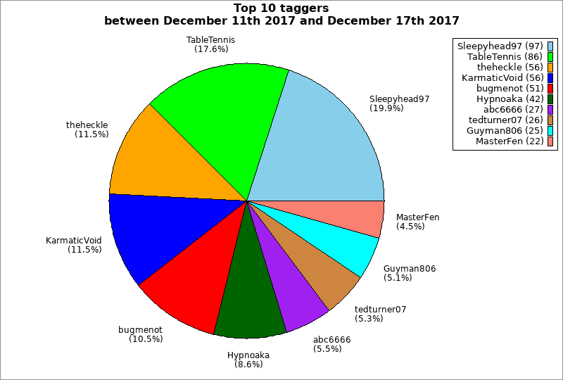 | Top 10 taggers between December 11th 2017 and December 17th 2017 | ||