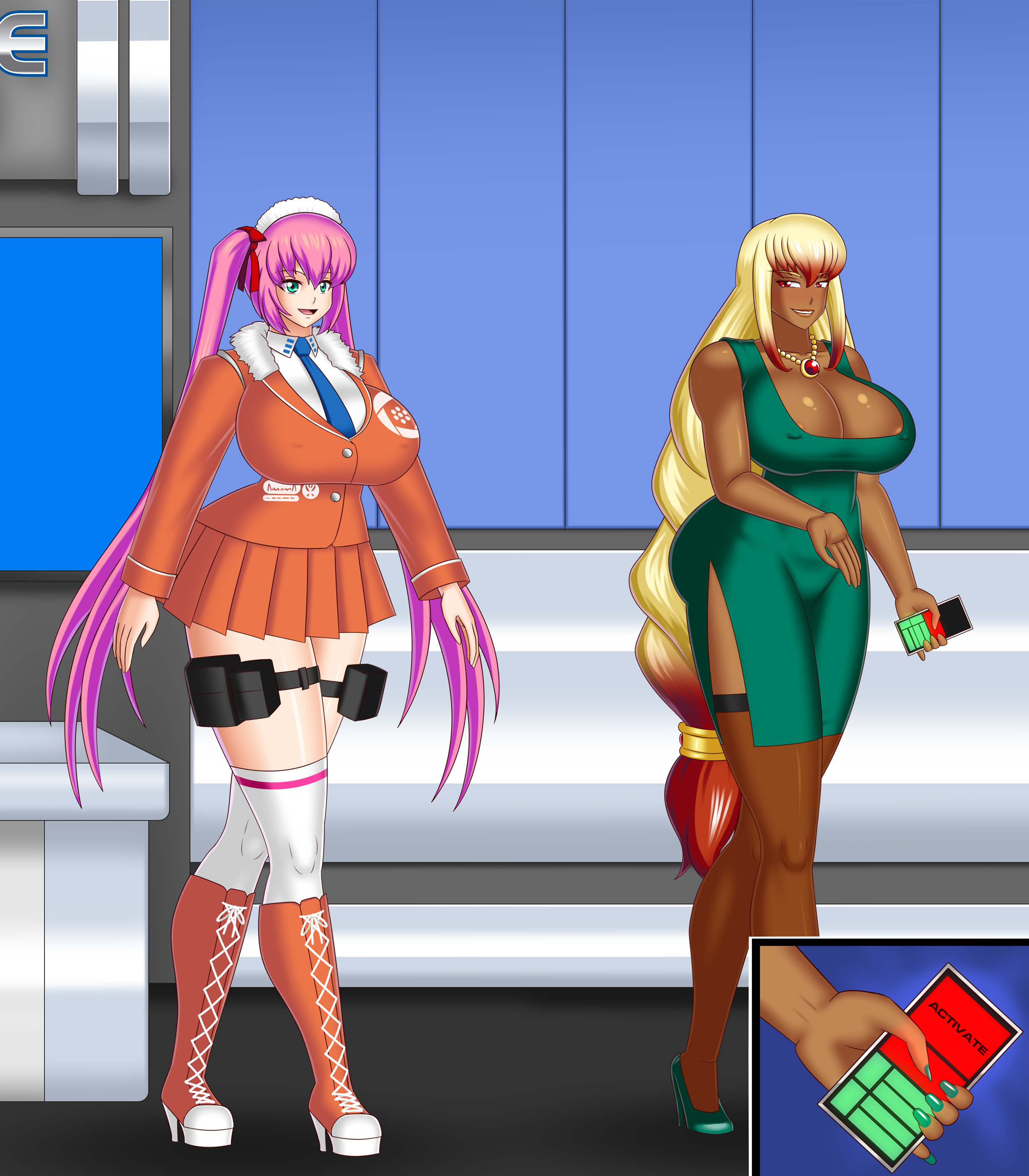 With Sayori now accepted as Rebecca's assistant, the dark skinned genius starts to show the pink haired girl around the Future Made main area. Rebecca then takes out her remote to alert her five Fembots to be ready to show off their new outfits.